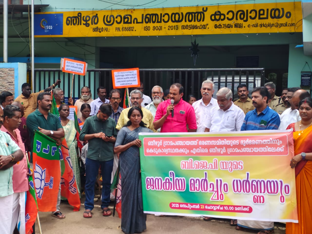 പഞ്ചായത്തിന്റെ കെടുകാര്യസ്ഥതകളും തകര്‍ന്ന പഞ്ചായത്ത് റോഡുകളും, വിവിധ കണ്‍സ്ട്രക്ഷന്‍ വര്‍ക്കുകളില്‍ നടന്ന അപാകതകളും ധര്‍ണാസമരത്തില്‍ ചൂണ്ടിക്കാണിച്ചു. ബിജെപി ഞീഴൂര്‍ പഞ്ചായത്ത് പ്രസിഡന്റ് ജോസ് പ്രകാശിന്റെ അധ്യക്ഷതയില്‍ നടന്ന സമരം കോട്ടയം വെസ്റ്റ് ജില്ലാ പ്രസിഡന്റ് ലിജിന്‍ലാല്‍ ഉദ്ഘാടനം ചെയ്തു. കുറവിലങ്ങാട് മണ്ഡലം പ്രസിഡന്റ് ഷിജോ സെബാസ്റ്റ്യന്‍, ജയചന്ദ്രന്‍ കൊക്കാലിങ്കല്‍, ജോയ് തോമസ് മണലേല്‍, സുനേഷ് കാട്ടാംപാക്ക്, സുരേഷ് കൊച്ചുപുരയ്ക്കല്‍, രഞ്ചിത്ത് രാധാകൃഷ്ണന്‍, അനില്‍കുമാര്‍ മാളിയേക്കല്‍, പി.സി. രാജേഷ്, മോഹനന്‍ നായര്‍ തെക്കേടം, വിനോദ് വിജയന്‍, കെ.എ. രഞ്ചിത്ത്, അജേഷ് കുമാര്‍, സുഷമ അജി, ശ്രുതി സന്തോഷ് എന്നിവര്‍ പ്രസംഗിച്ചു.