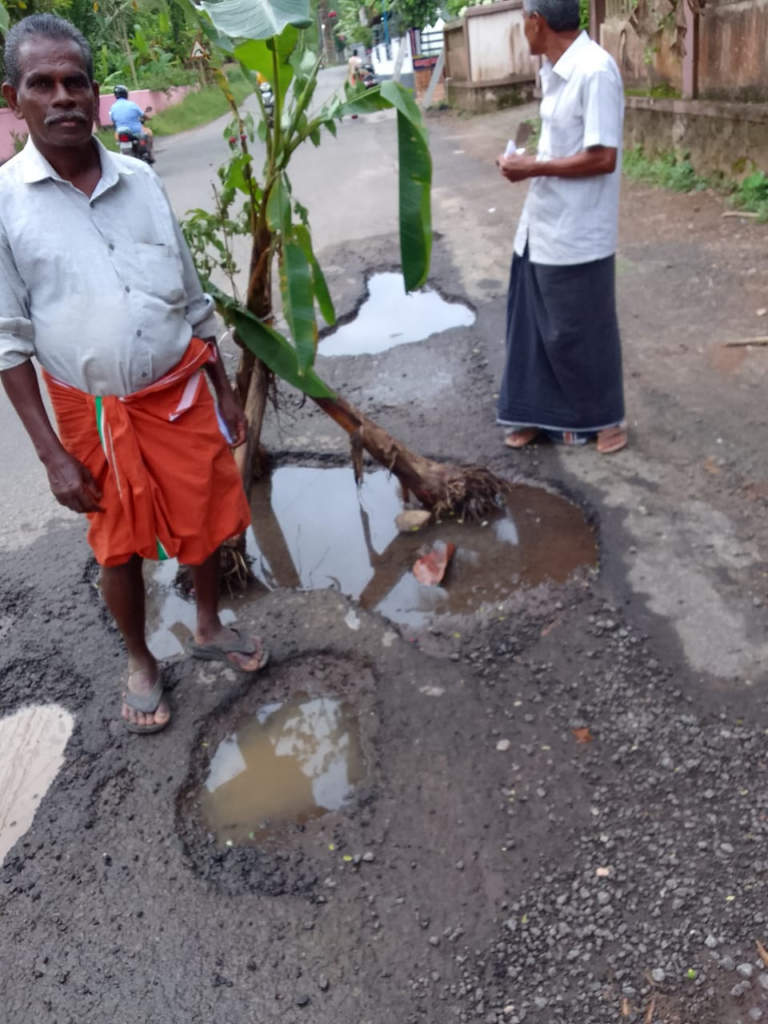 കളമ്പുകാട് റോഡിലെ കുഴിയില്‍ നാട്ടുകാര്‍ വാഴ വച്ചു പ്രതിക്ഷേധിച്ചു