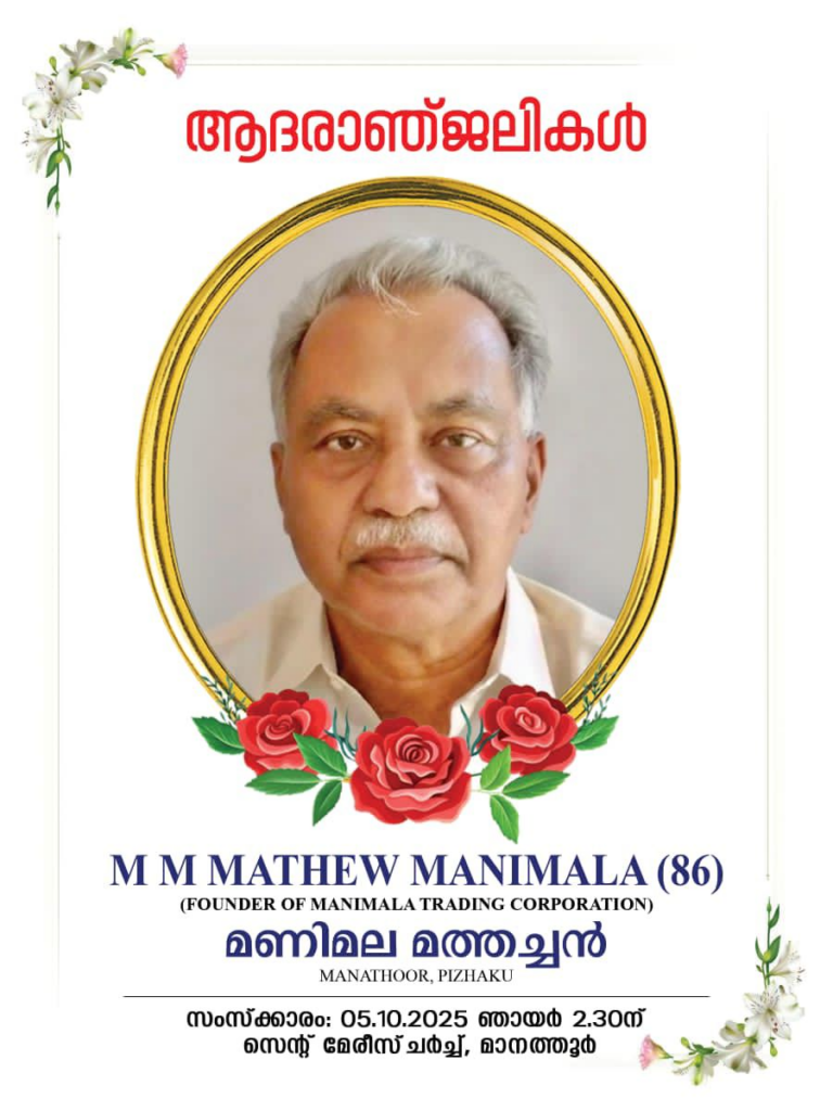 05-10-2025 ഞായർ 2:30 pm ന് ഭവനത്തിൽ ആരംഭിച്ച് മാനത്തൂർ സെന്റ് മേരിസ് പള്ളി കുടുംബക്കല്ലറയിൽ.