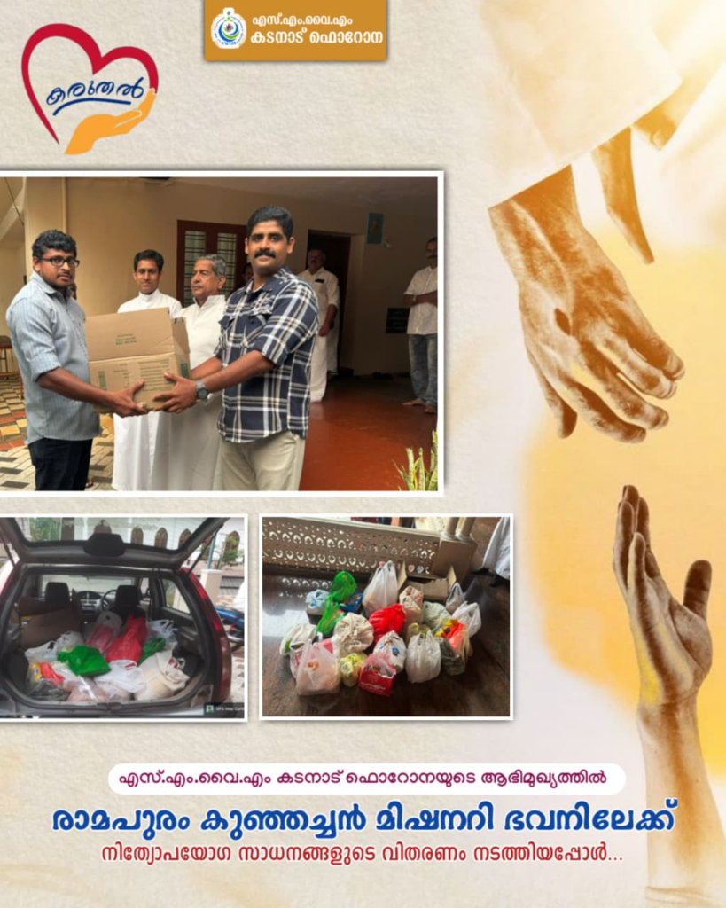 കടനാട്: എസ്.എം.വൈ.എം കടനാട് ഫൊറോനയുടെ ആഭിമുഖ്യത്തിൽ നടത്തിവരുന്ന ‘കരുതൽ’ എന്ന സാമൂഹ്യ സേവന പദ്ധതിയുടെ ഭാഗമായി രാമപുരം കുഞ്ഞച്ചൻ മിഷനറി ഭവനിലേക്ക് നിത്യോപയോഗ സാധനങ്ങൾ വിതരണം ചെയ്തു.